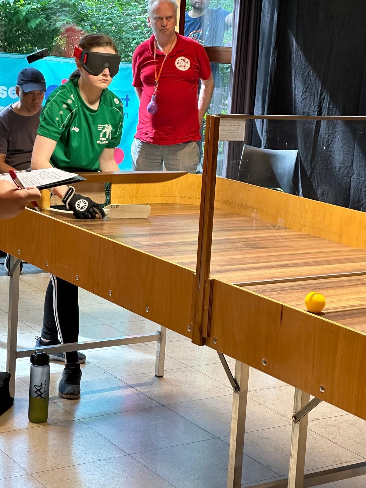 Showdown is een Europese sport speciaal ontwikkeld voor mensen met een visuele handicap, maar kan door iedereen gespeeld worden omdat je met een afgeplakte skibril op speelt.